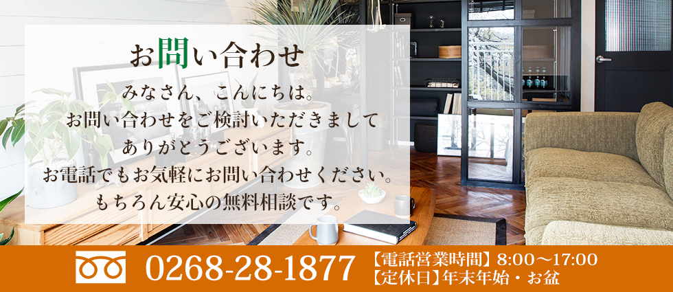 お問い合わせ 必須お問い合わせ内容 ※お急ぎの方は、 直接 0268-28-1877(8:00~17:00)まで、お電話下さい。 例:注文住宅を検討しています。予算は900万円程を予定。工事は来月~再来月で考えています。 必須お名前 例: 山田 太郎 必須メールアドレス 例: t_yamada@sample.jp 任意郵便番号 住所検索 例: 123-4567 必須住所 例:長野県上田市**** 任意電話番号 例: 0268-00-0000 ※相談内容は個人情報保護法に適用いたします。 24時間以内に回答を心がけておりますが、相談内容等によって、 2〜3日かかる事もございますが御了承下さい。 お電話でもお気軽にどうぞ! 内容をご確認の上、よろしければ下記の「入力内容を確認する」ボタンを押して下さい。 個人情報利用目的 ・お客様のご要望に合わせたサービスを提供させていただくための各種ご連絡。 ・お問い合わせいただいたご質問への回答のご連絡。 尚、お客様から収集する個人情報は弊社の定めるプライバシーポリシーに則って厳重に管理いたします。 プライバシーポリシー 弊社では、利用者のみなさんの個人情報がきちんと守られることを、何よりも大切にしています。また、利用者ご本人への事前の許可なしに第三者に個人情報を配送作業以外に開示することは絶対にいたしません。 どんな些細な事でも結構です。ご相談、お見積もりなど、お気軽にご連絡下さい。上記メールフォームからご連絡いただくか、電話にてご連絡下さい。 必須マークがついている項目は必ずご記載下さい。(株)、(有)や丸囲み数字等の機種依存文字は、文字化けの原因となりますので、使用しないようお願いいたします。