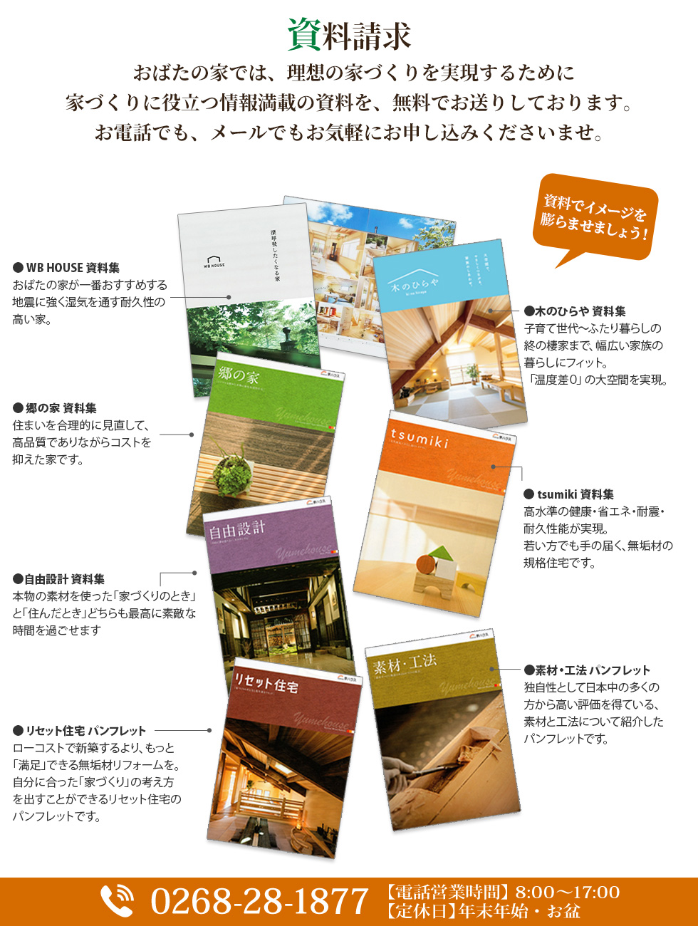 資料請求 必須ご希望の資料 ご希望の資料にチェックを入れてページ下のお客様情報をご記入の上送信してください。 選択中 WB HOUSE 資料集木造による丈夫な骨組みで、地震に強く湿気を通す優れた能力で湿度に負けない耐久性の高い家。おばたの家が一番おすすめする「WBHOUSE」の資料集です。 選択中 木のひらや 資料集子育て世代~ふたり暮らしの終の棲家まで、幅広い家族の暮らしにフィットする、「温度差0」の大空間を実現した「木のひらや」の資料集です。 選択中 郷の家 資料集住まいのあらゆるところを合理的に見直し、高品質でありながらコストを抑えた「郷の家」の資料集です。 選択中 tsumiki 資料集高水準の健康・省エネ・耐震・耐久性能、若い方でも手の届く無垢材規格住宅の「tumiki」についての資料集です。 選択中 自由設計 資料集本物の素材を使った「家づくりのとき」と「住んだとき」どちらも最高に素敵な時間を過ごせる「自由設計」についての資料集です。 選択中 素材・工法 パンフレット夢ハウスが大事にしている「素材」と4つのテーマ。独自性として日本中の多くの方から高い評価を得ている素材と工法について紹介したパンフレットです。 選択中 リセット住宅 パンフレットローコストで新築するより、もっと「満足」できる無垢材リフォームを。自分に合った「家づくり」の考え方を出すことができるリセット住宅について紹介したパンフレットです。 必須お名前 例: 山田 太郎 任意郵便番号 住所検索 例: 123-4567 必須住所 例:長野県上田市**** 必須電話番号 例: 0268-00-0000 必須メールアドレス 例: t_yamada@sample.jp ※相談内容は個人情報保護法に適用いたします。 24時間以内に回答を心がけておりますが、相談内容等によって、 2〜3日かかる事もございますが御了承下さい。 お電話でもお気軽にどうぞ! 内容をご確認の上、よろしければ下記の「入力内容を確認する」ボタンを押して下さい。 個人情報利用目的 ・お客様のご要望に合わせたサービスを提供させていただくための各種ご連絡。 ・お問い合わせいただいたご質問への回答のご連絡。 尚、お客様から収集する個人情報は弊社の定めるプライバシーポリシーに則って厳重に管理いたします。 プライバシーポリシー 弊社では、利用者のみなさんの個人情報がきちんと守られることを、何よりも大切にしています。また、利用者ご本人への事前の許可なしに第三者に個人情報を配送作業以外に開示することは絶対にいたしません。 どんな些細な事でも結構です。ご相談、お見積もりなど、お気軽にご連絡下さい。上記メールフォームからご連絡いただくか、電話にてご連絡下さい。 必須マークがついている項目は必ずご記載下さい。(株)、(有)や丸囲み数字等の機種依存文字は、文字化けの原因となりますので、使用しないようお願いいたします。