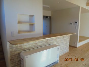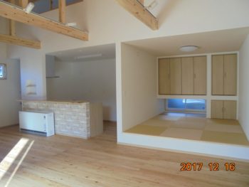 | ご提案内容 | コンパクトでありながらも快適で開放的な間取りをご提案。 床材や梁には無垢を使用し温かみのある空間が特徴のリビングに仕上がりました。 一見平屋のように見える二階建ての住まいです。 |